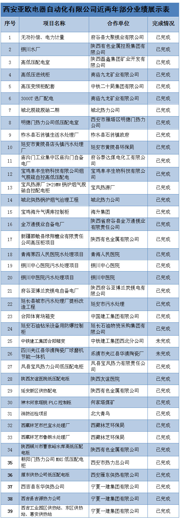 西安亞歐電氣設備集團有限公司近兩年部分業績展示表